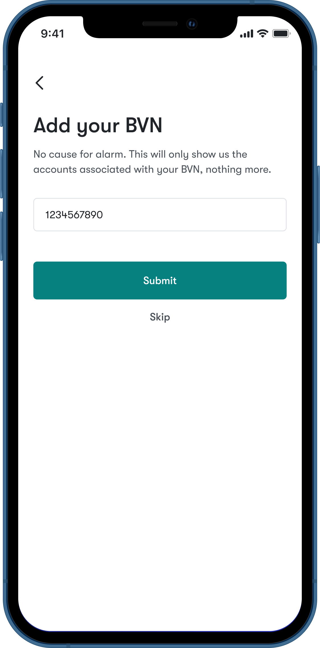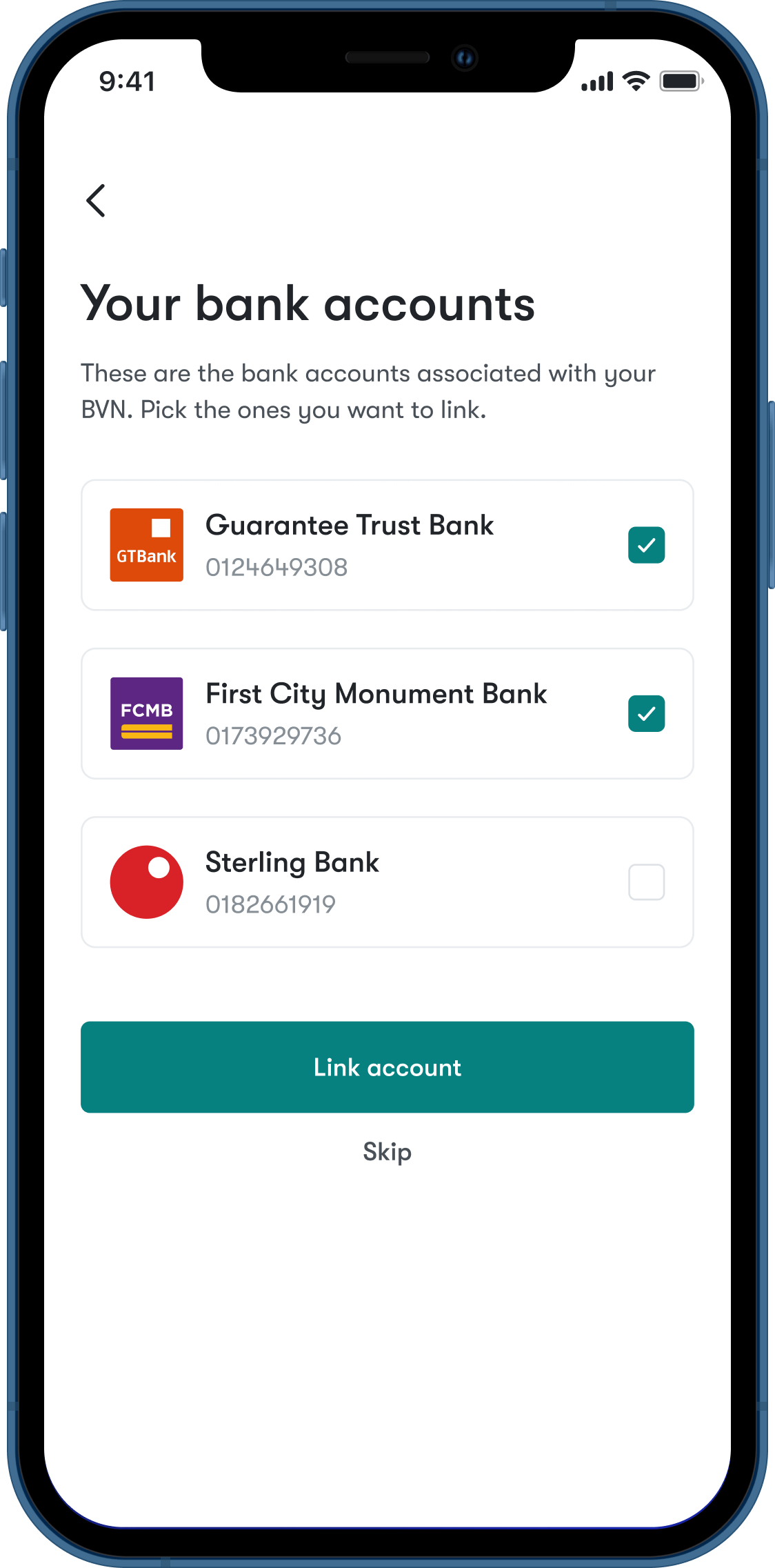 Users create an account and link their bank account(s). In Nigeria, everybody with at least a bank account has a number known as the Bank Verification Number (BVN). The BVN ties together every bank account an individual owns, eliminating the need for repeating the process of linking different bank accounts. By using this number, all accounts associated with that account is revealed and the user can then choose the account they want to link.