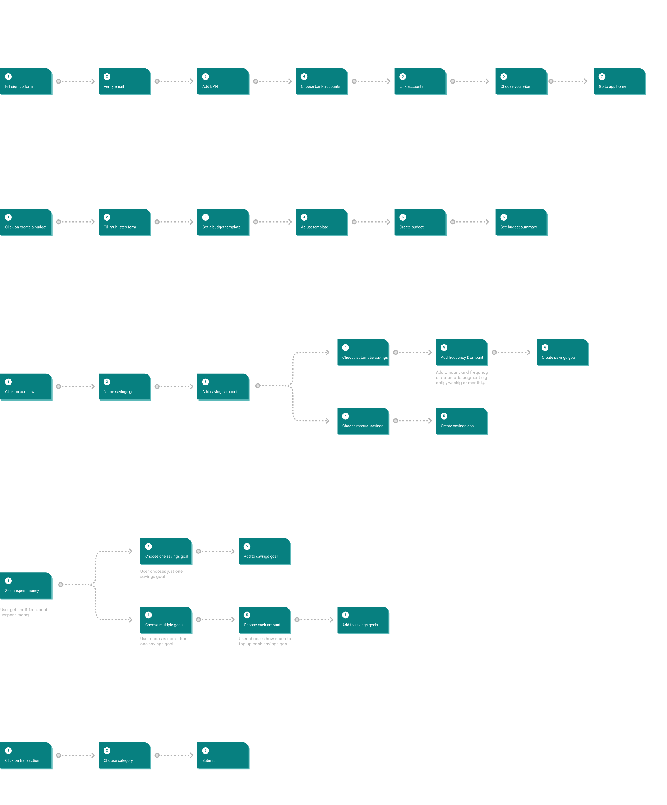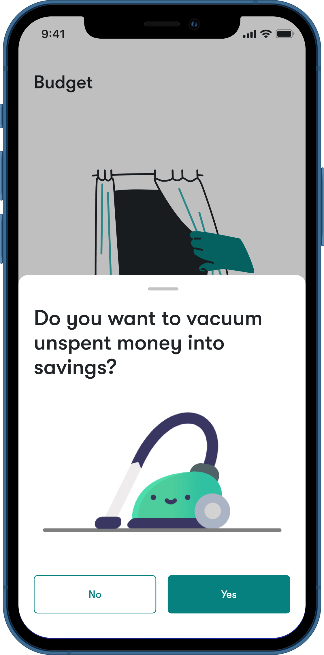 At the end of a budget period, any unspent money (a budget surplus) is vacuumed into the savings. Users can then choose which of their savings goals (one or more) they want to add this surplus to. The idea is to help users prioritize meeting their savings goals and develop an instinctual savings habit.