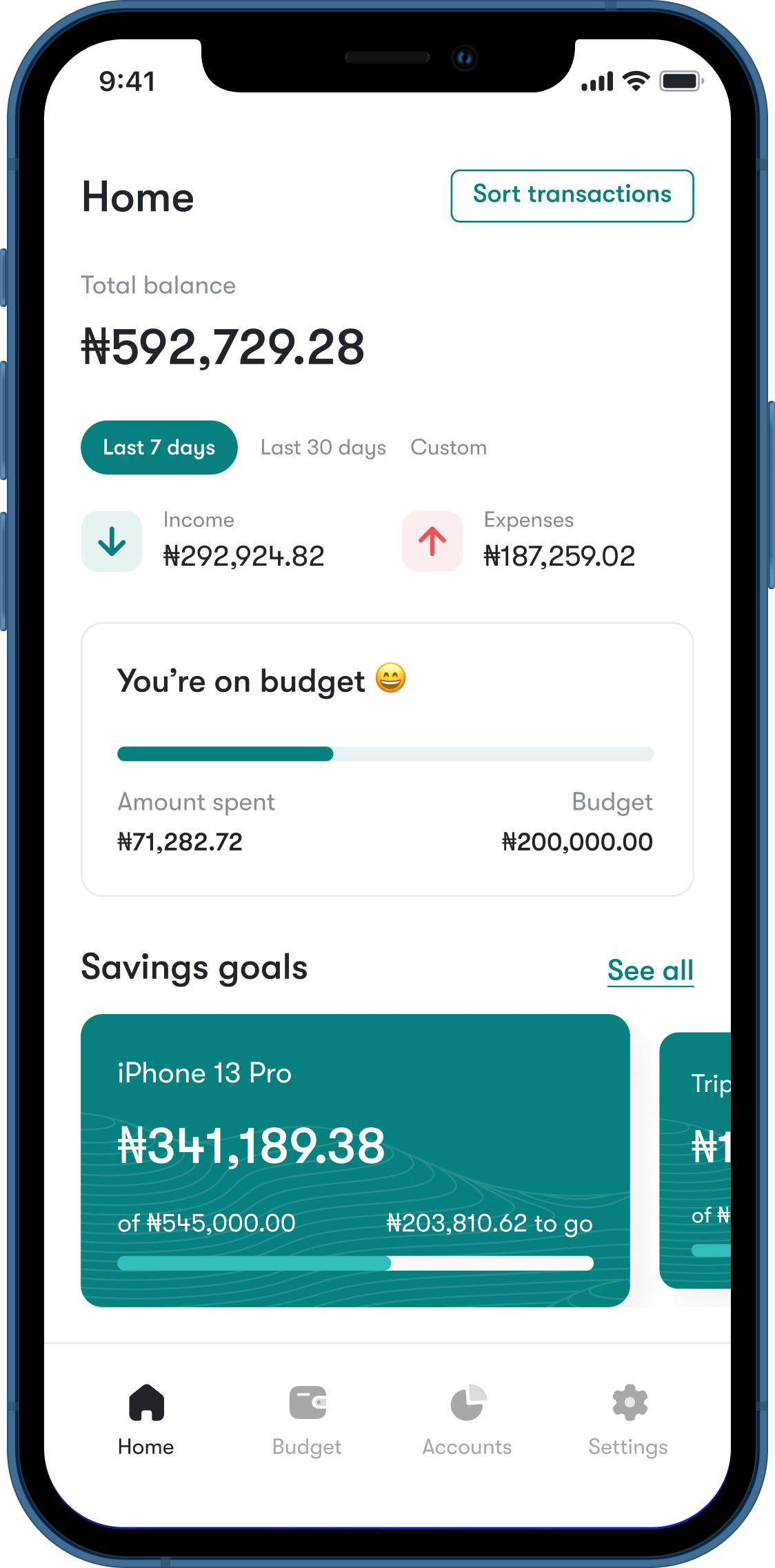 The home screen shows an overview of what is going. It helps you know at a glance how much is going in and out of your account, whether you’re on budget, and where you are on your savings goals.