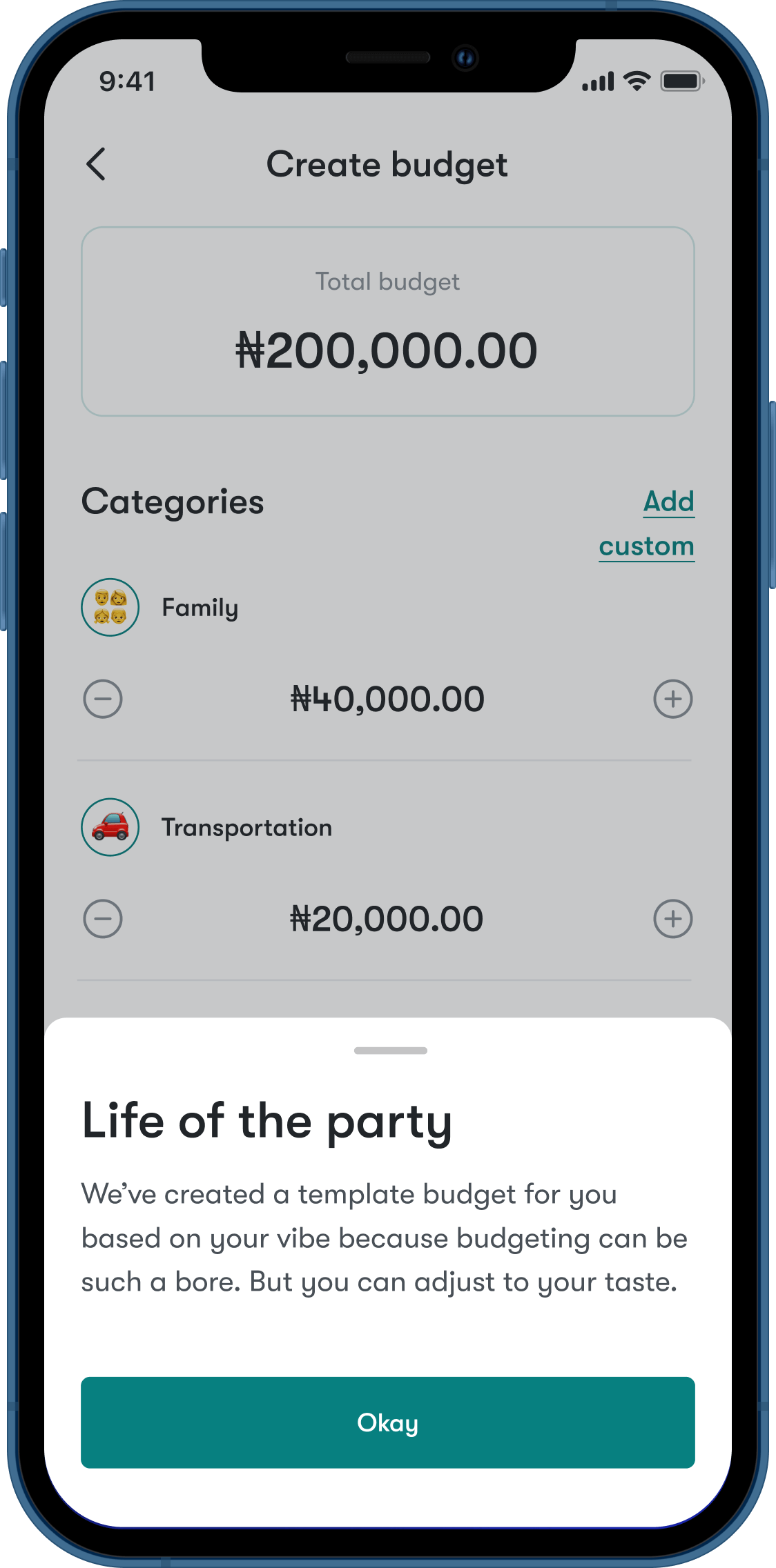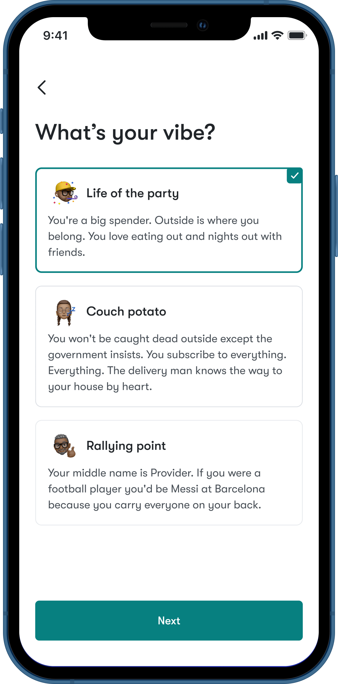 One of the recurring things from the survey as well as individual interviews was that budgeting is stressful. One of the ways I thought to solve this problem is to give the users a starting point. During the onboarding, users are asked to choose a vibe. Crafted from the user personas, a vibe is a basic profile that helps to create a budget template for a user, with the budget amount shared into categories based on predetermined calculations for each profile.