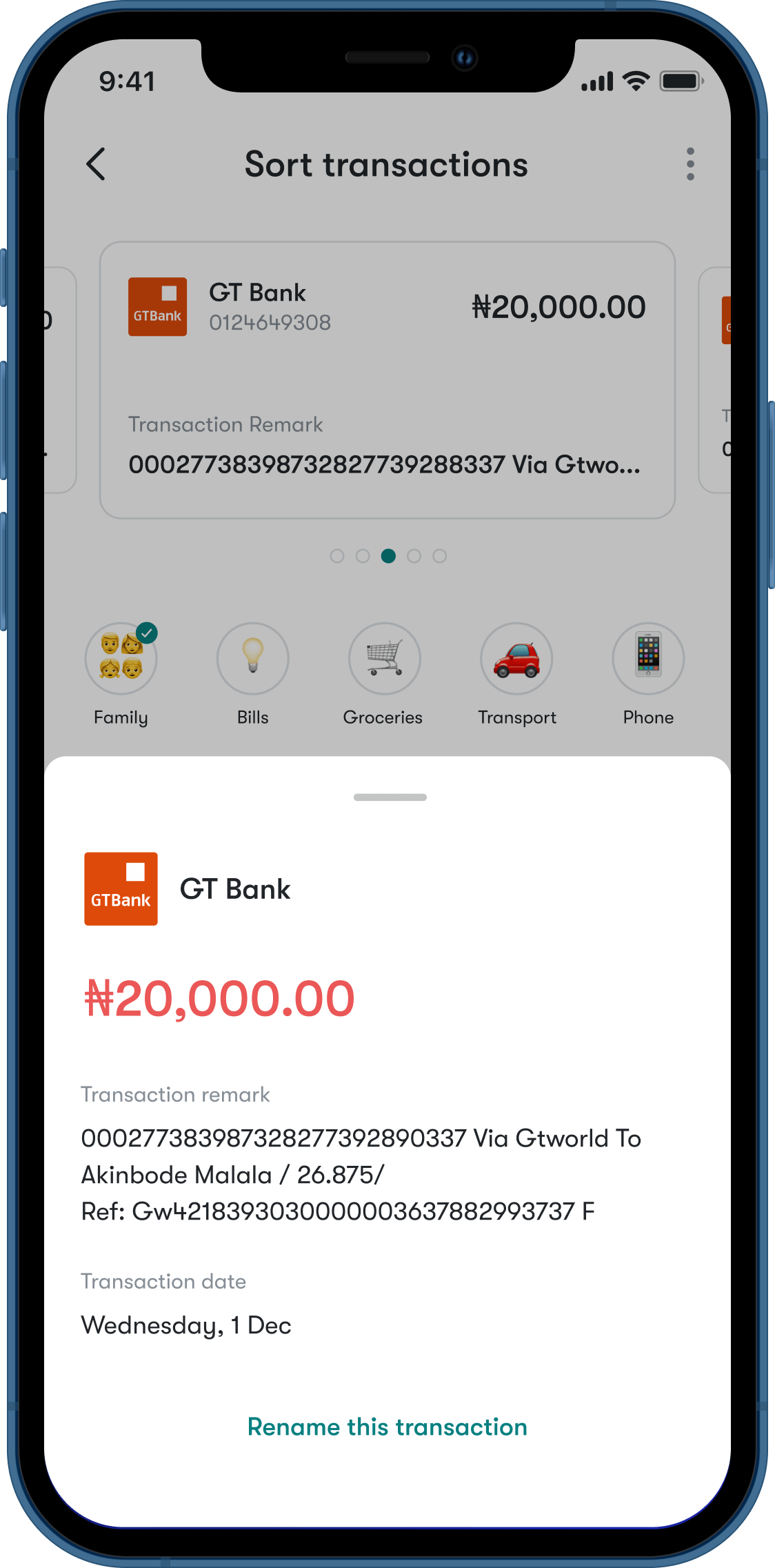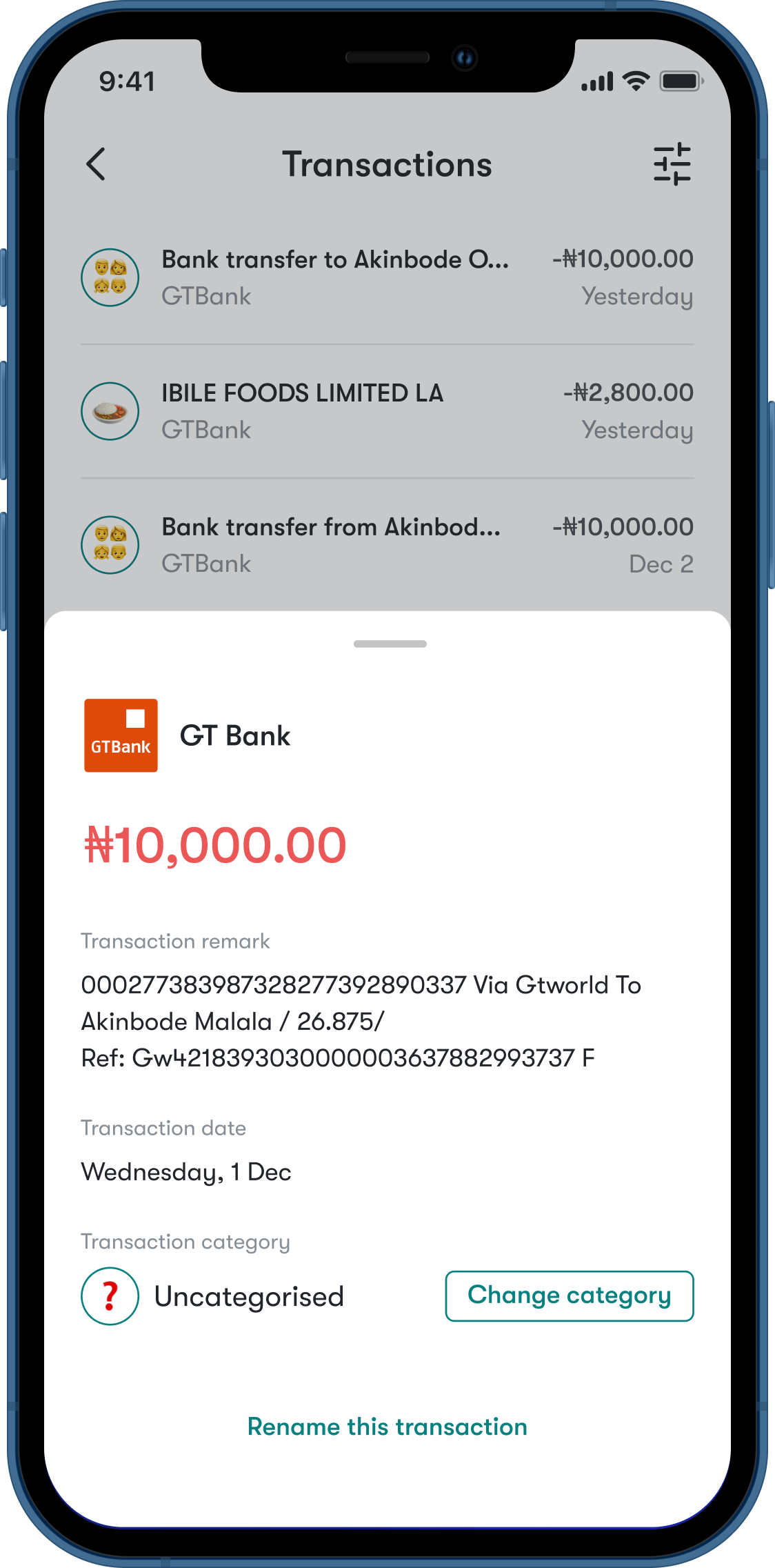 - Previous categorisation: Whenever we see a similar transaction from one you’ve previously had, we’ll sort it into the category you had before. Here, we assume that if you sent money to someone before and you categorised the transaction as “family”, the next time you send money to them, we assume it’s in the same category.