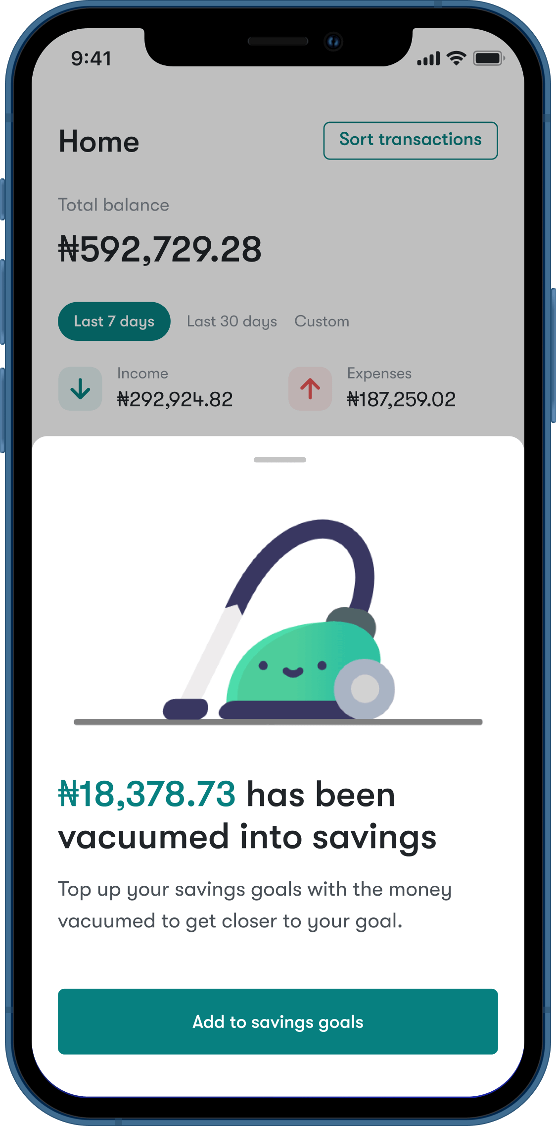 - Vacuuming, which can help users develop instinctive saving habit by sweeping up unspent money into savings goals.