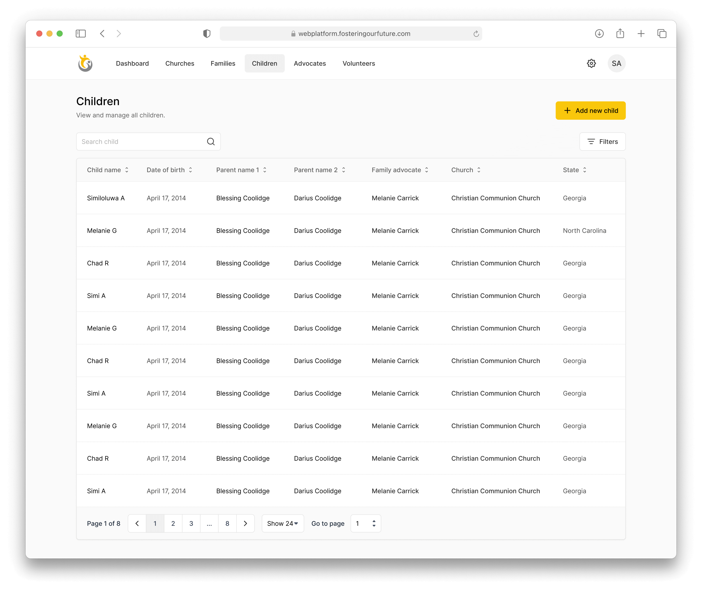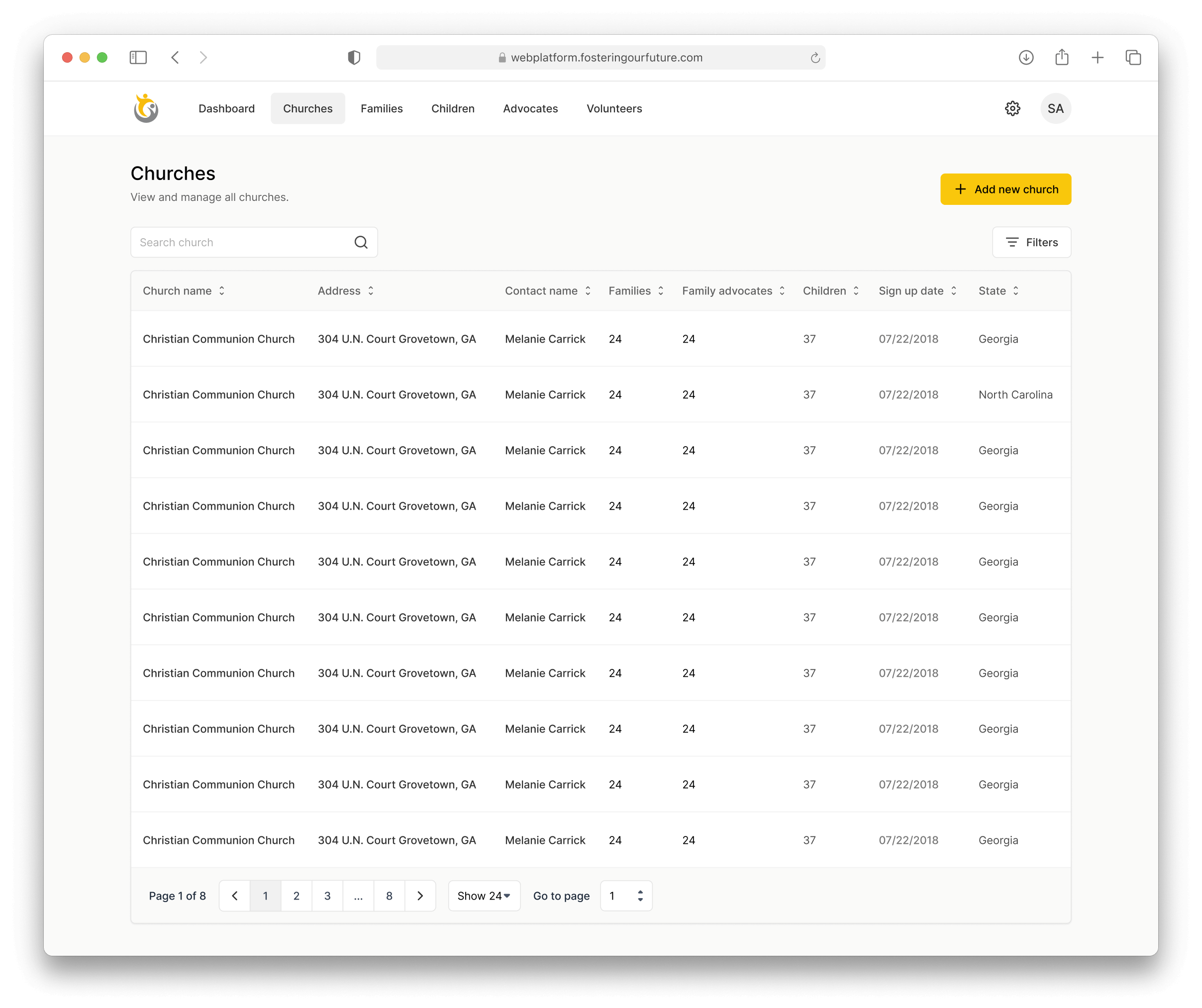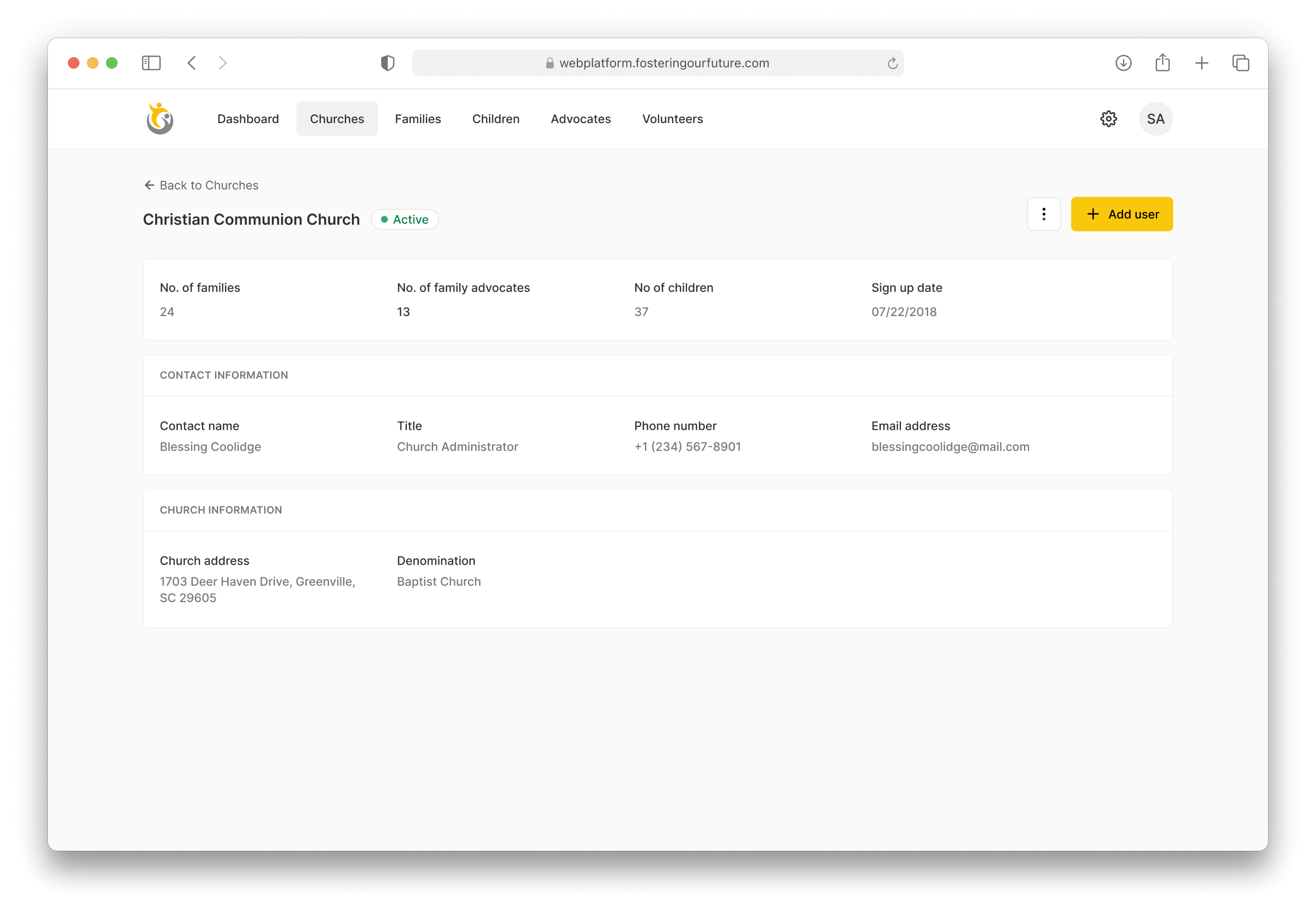 Fostering Our Future can add and manage churches within their database. Each church will have their own portal where they can manage their family advocates and foster families.