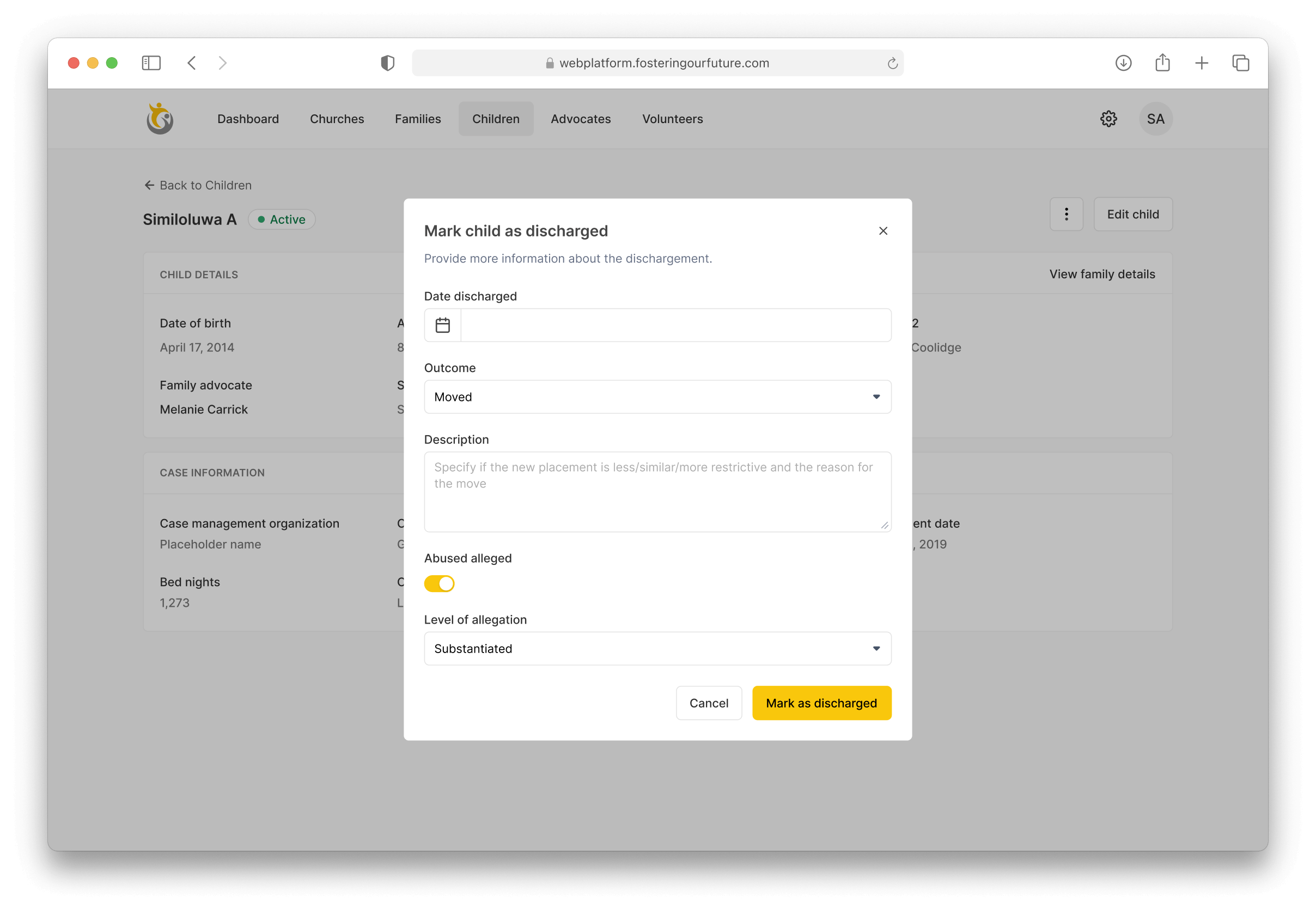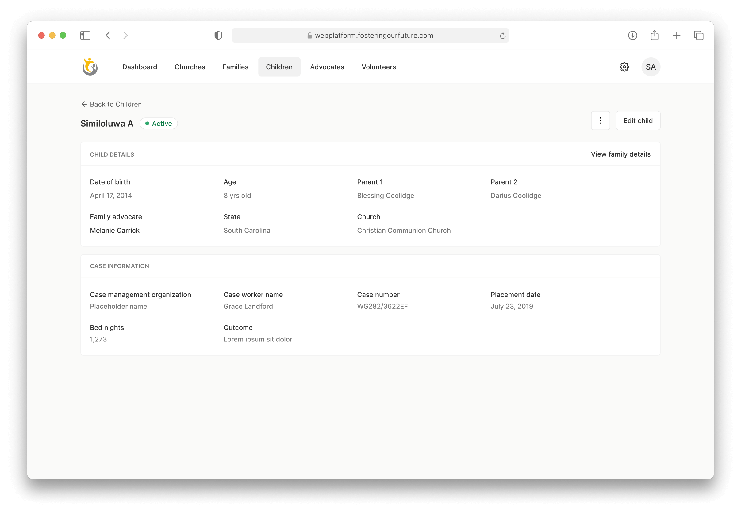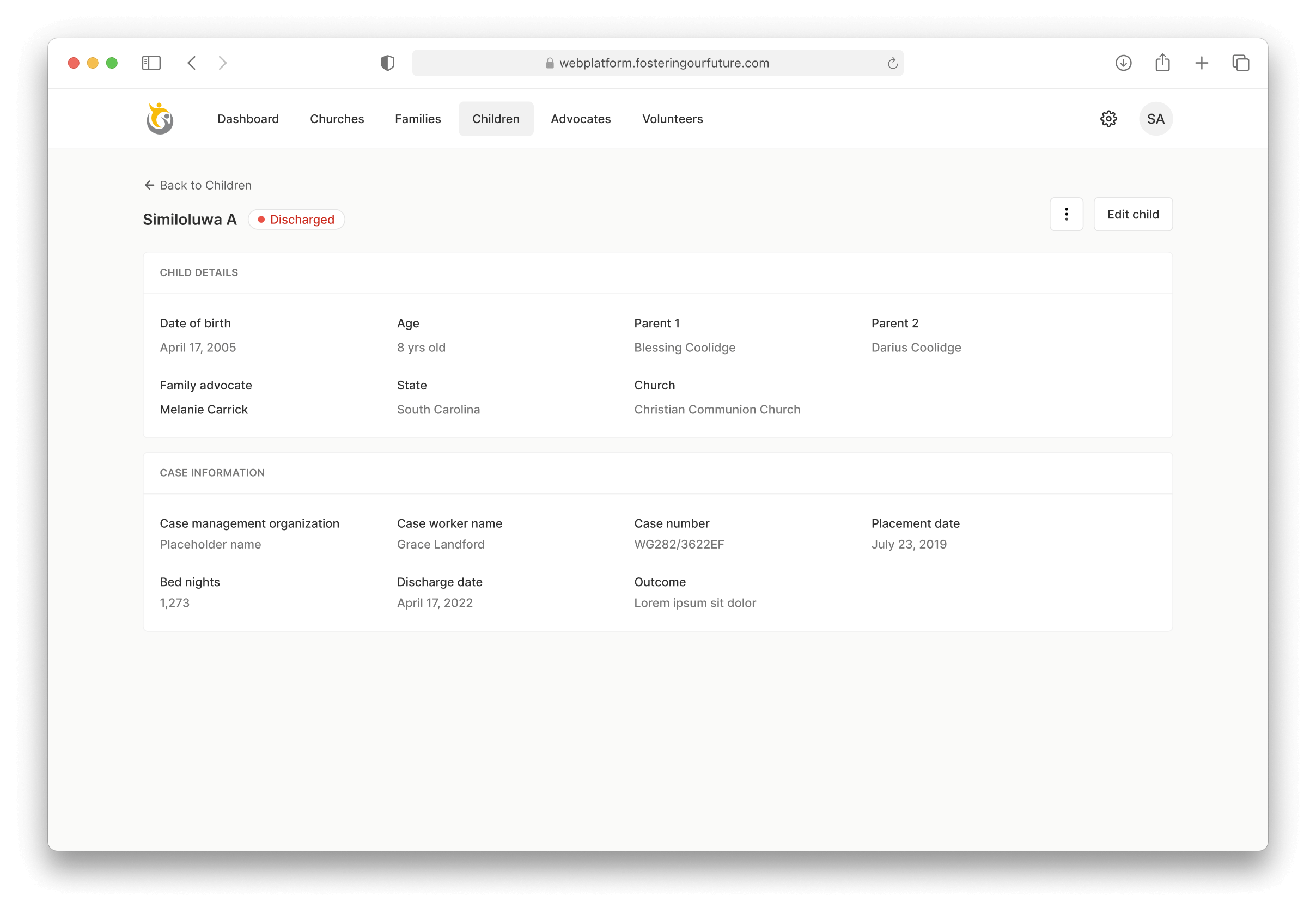 Fostering Our Future can add and manage churches within their database. Each church will have their own portal where they can manage their family advocates and foster families.