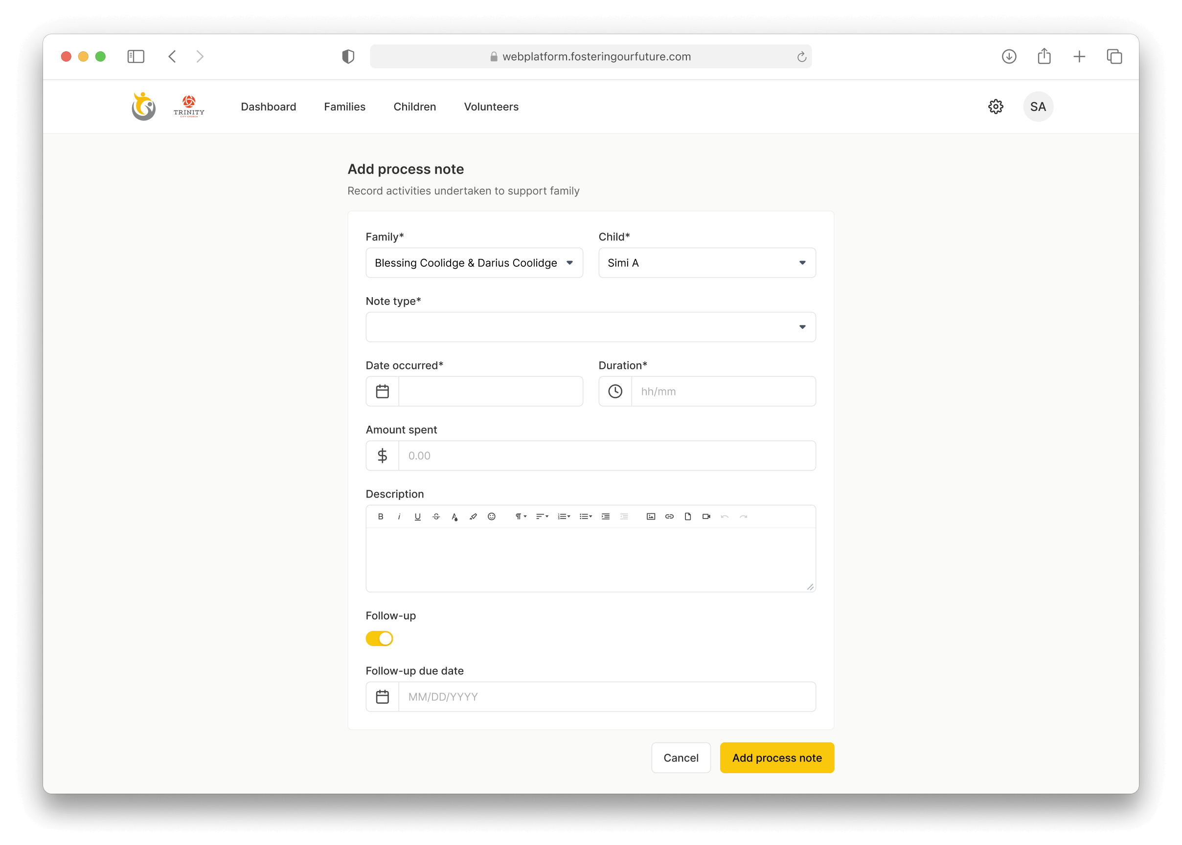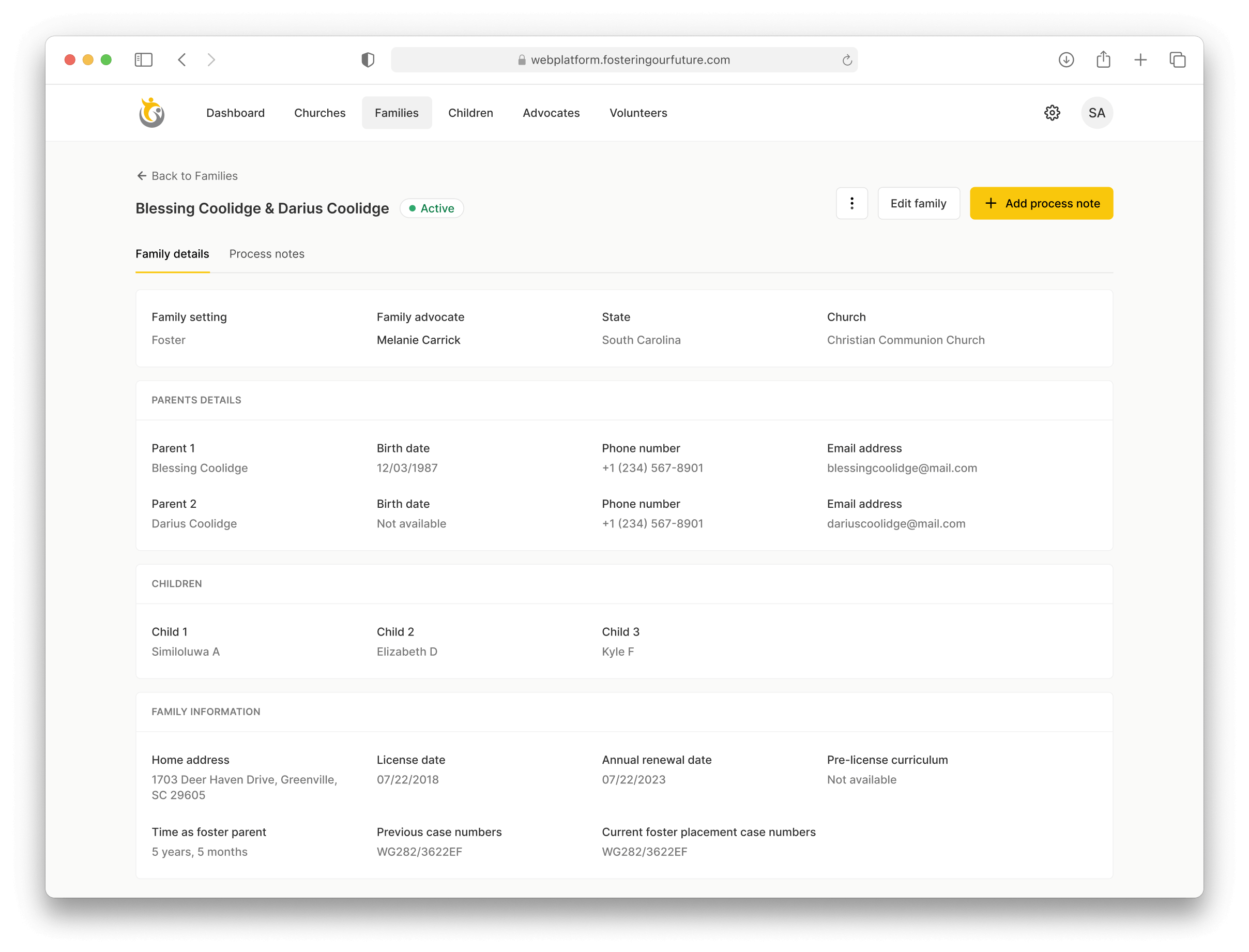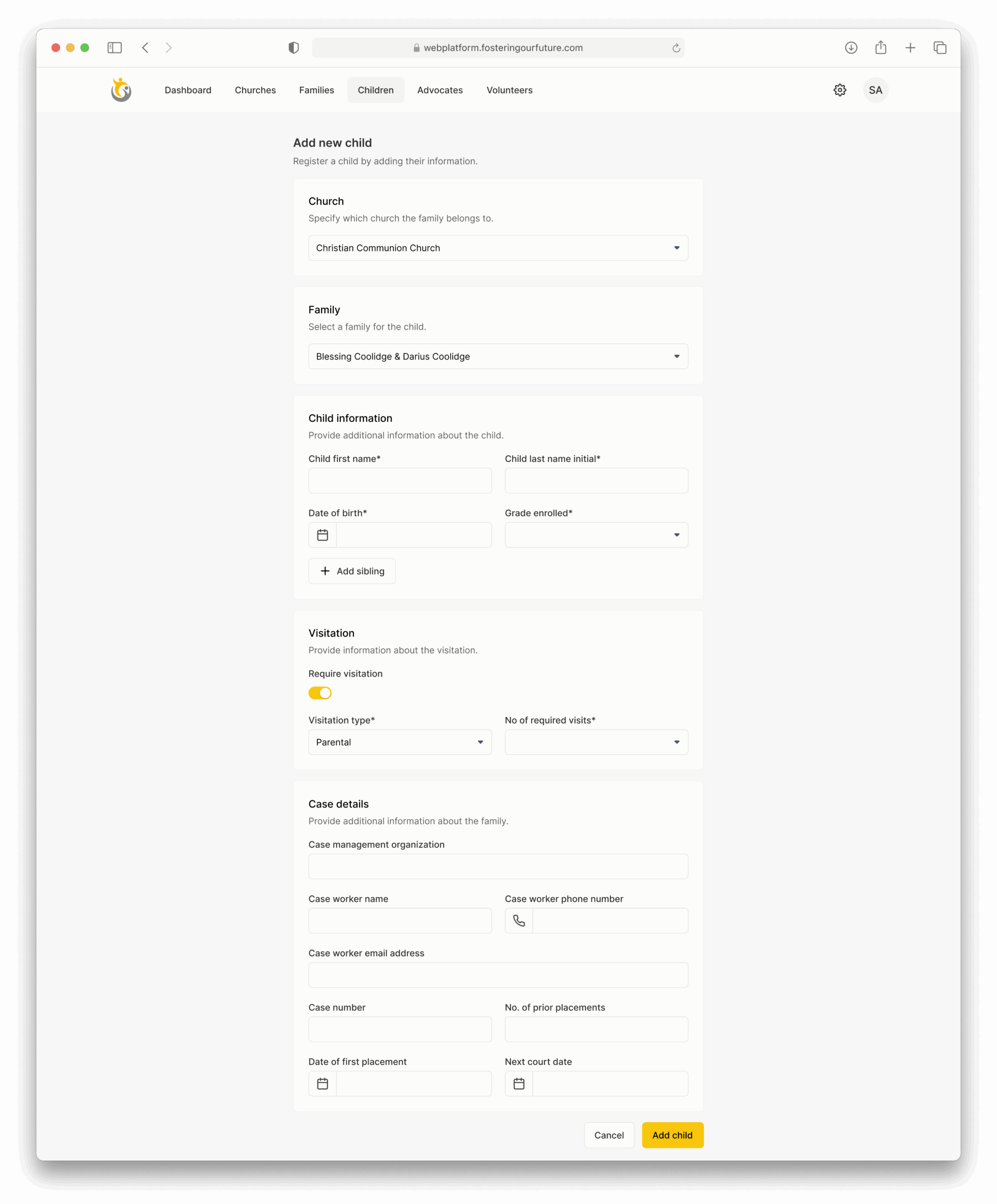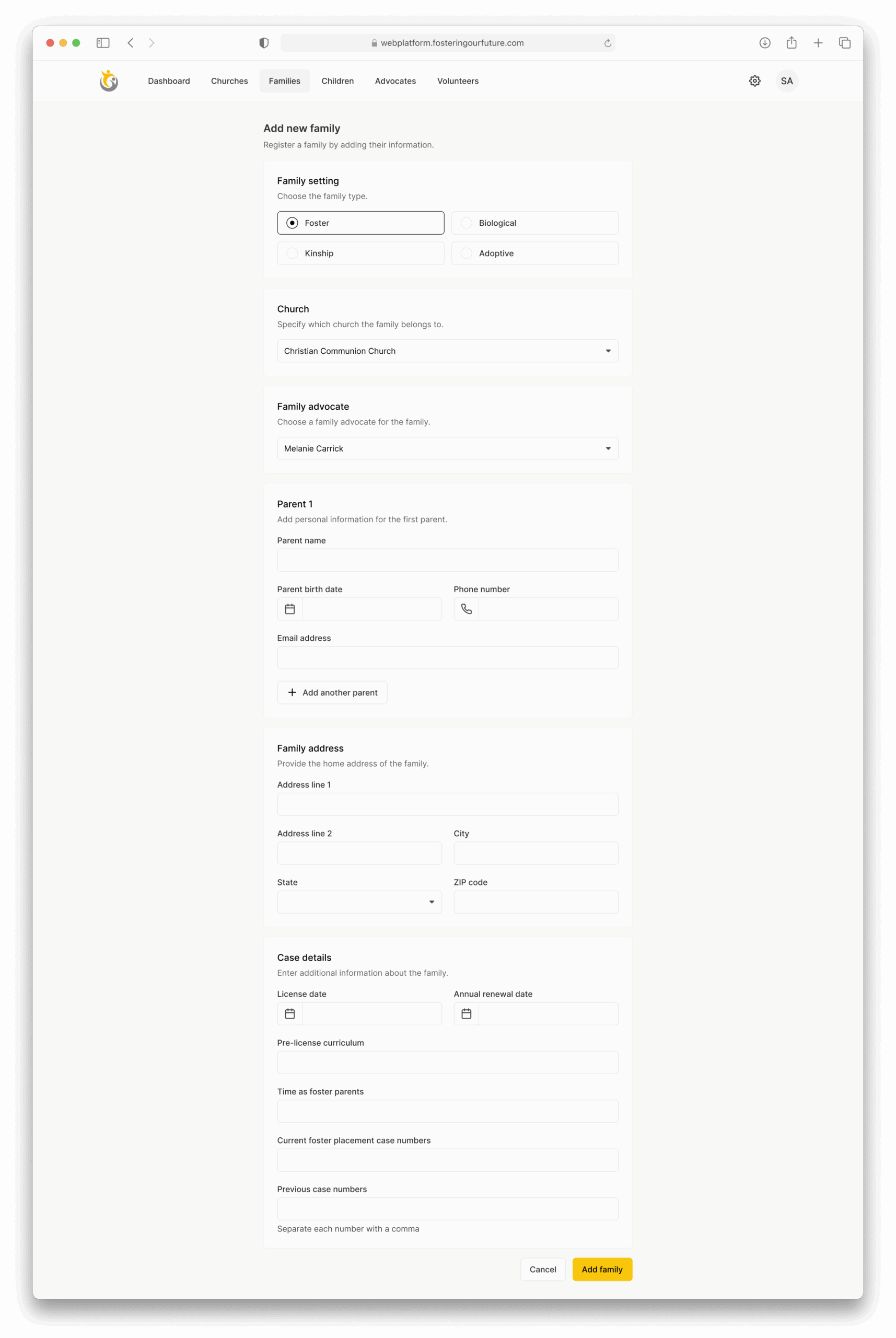Family advocates come alongside families to support them and help with the goal of reunification or other positive outcomes for foster children. Family advocates can login to their church’s portal and view and manage the families assigned to them.