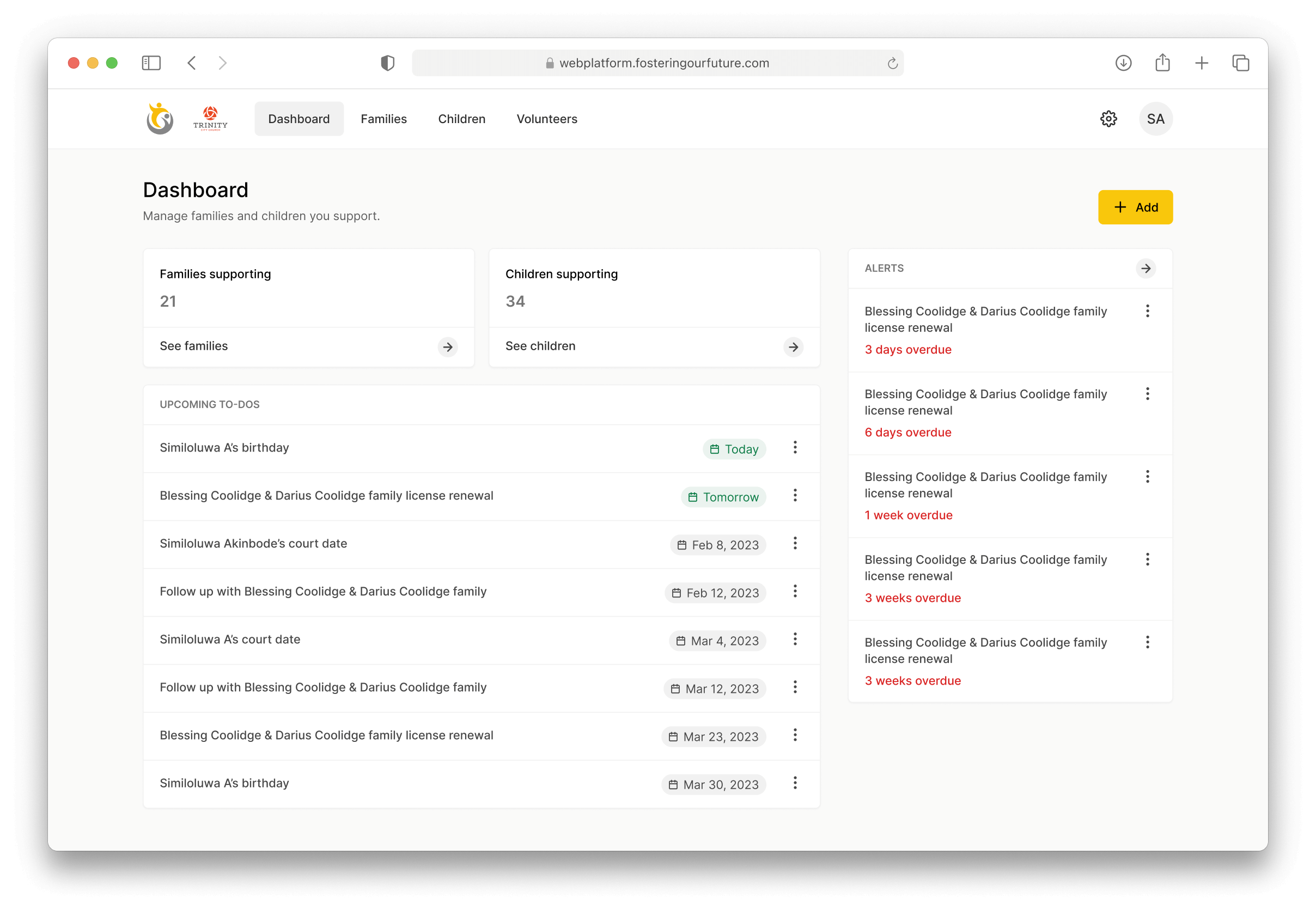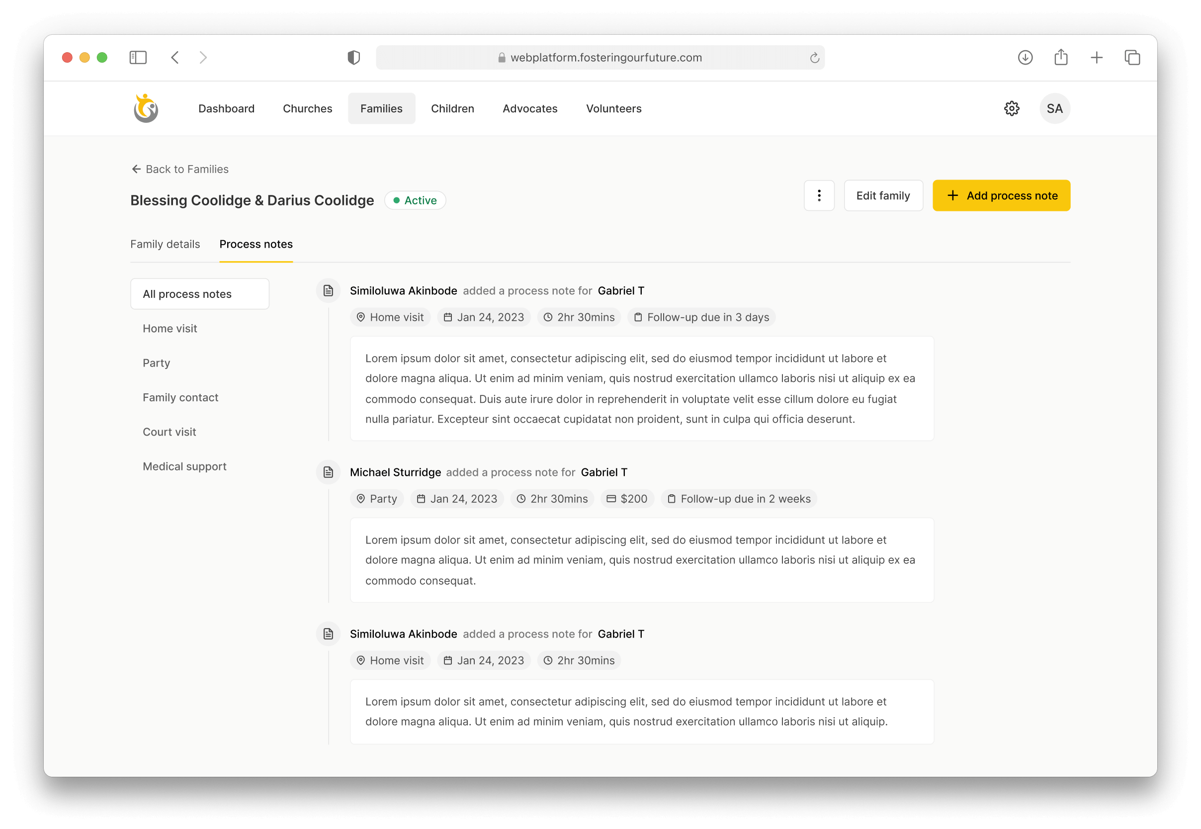They get sent reminders about important activities like upcoming court dates, children’s birthdays, license renewals and when follow ups with the families are due. They have a record of all activities that have been undertaken to support the family which include home visits, court visit support and medical support and can also track any alleged abuse of a child, whether substantiated or not for investigations.