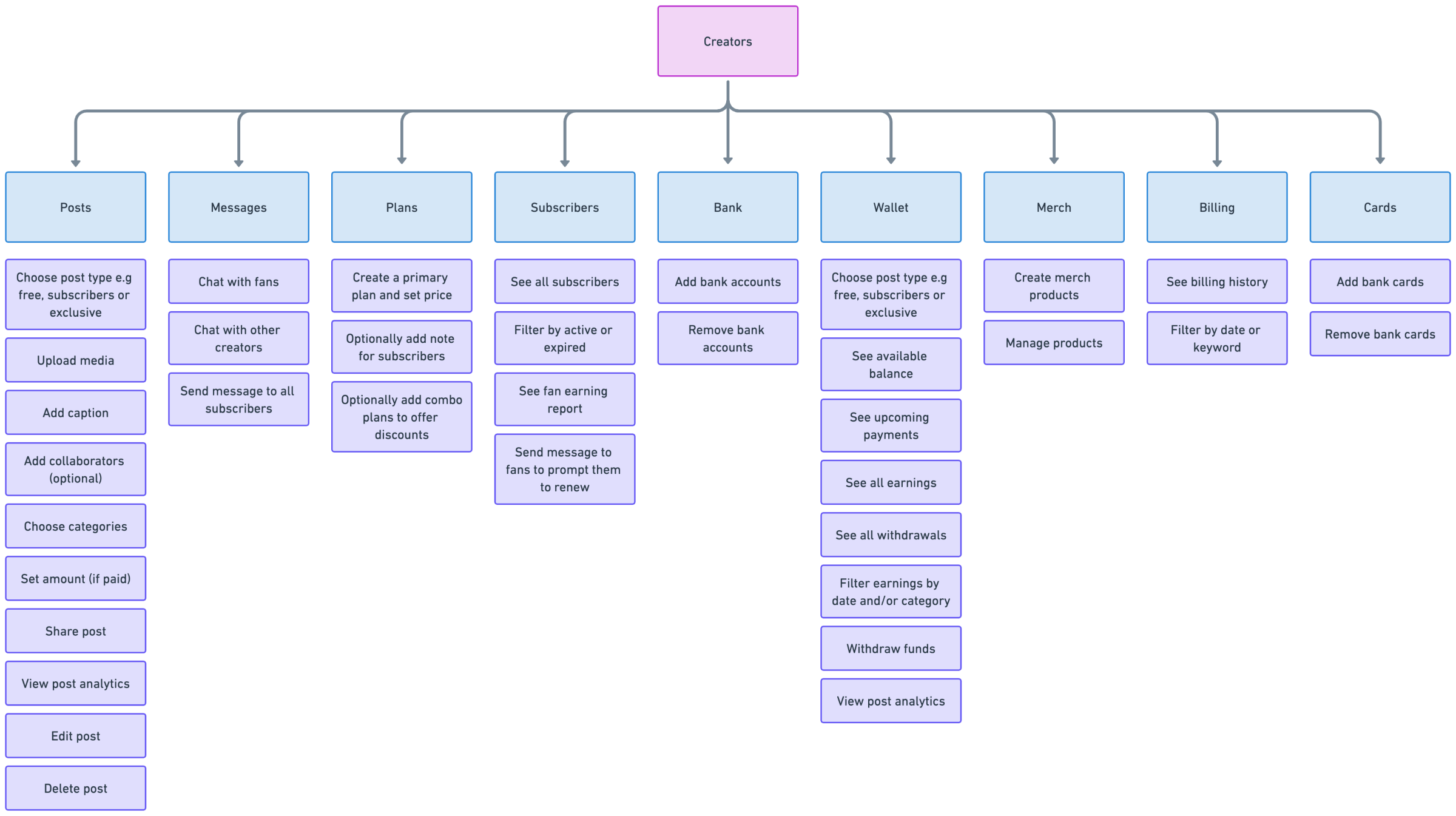 With the app supporting two user types (creator and fans), it was important to map out the unique experiences of both sets of users and how they feed into each other. To make this clear, I created a flowchart with all the features and the capabilities of the users.